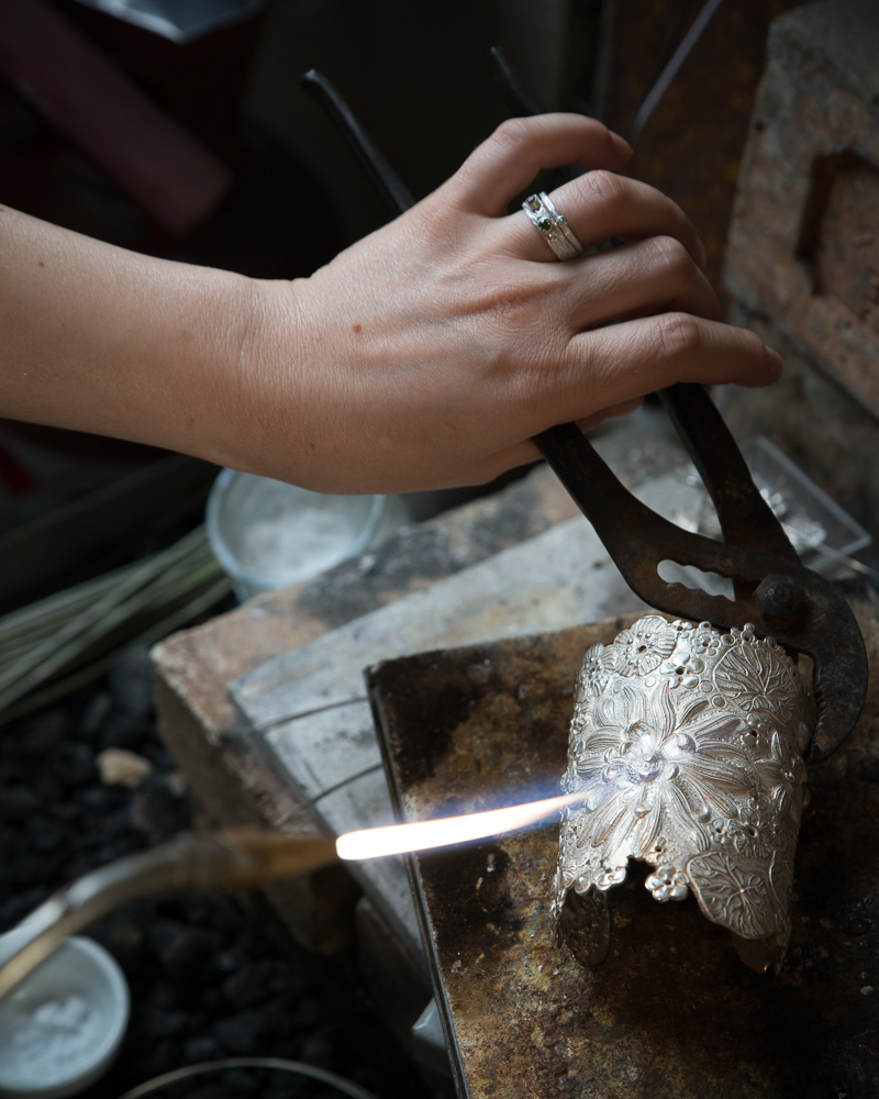 A rtisan d’Art indépendant depuis 2006, je pratique un savoir-faire traditionnel et ancestral: la ciselure. Métier d’Art peu connu du grand public, je l’intègre dans une vision contemporaine où l’abstrait et le figuratif, se mêlent harmonieusement. Chaque bijou est ainsi minutieusement façonné à la main, par mes soins, en modèle unique. Travaillant les métaux nobles, je cisèle, façonne, frappe la matière pour lui donner les reliefs et textures recherchées. Le thème prédominant dans mes créations est celui de la Nature, subdivisé en deux univers : l’Eau et la Terre. Aujourd’hui, très attachée au fait que chaque personne est unique, je réalise aussi des bijoux sur mesure en argent et or pour célébrer des moments précieux de la vie tels que mariage, naissance, anniversaire. Mes client.e.s me dévoilent ainsi un peu de leur histoire, leurs envies, afin que le bijou réalisé soit le reflet de leur âme et de leur vécu.